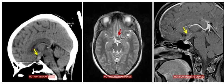 Fig. 3 Hypothalamus cavernoma Popcorn appearance yellow and red arrows .
