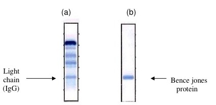 They are found in multiple myeloma disorders and may arise from any of the immunoglobulin classes. Monoclonal light chains are produced in 50% of myeloma and in only 15% heavy chains are found. Increased amount of light chain protein (monoclonal) is excreted in urine as Bence jones protein of type λ. In this case, urine electrophopresis shows very sharp band at the γ- region as seen in Figure 2