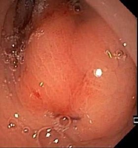 A 37-year-old female presented with a history of epigastric pain (6/10 )of 3 weeks duration. The pain was a burning type with no reference or radiation. She stated that for the previous 2 weeks her pain was aggravated by food intake. She denied any alarming symptoms in the form of loss of appetite and weight loss. There was no history of vomiting or melena. Her clinical examination was normal .The UGI endoscopy showed following lesion in the antral area .What is the likely diagnosis?