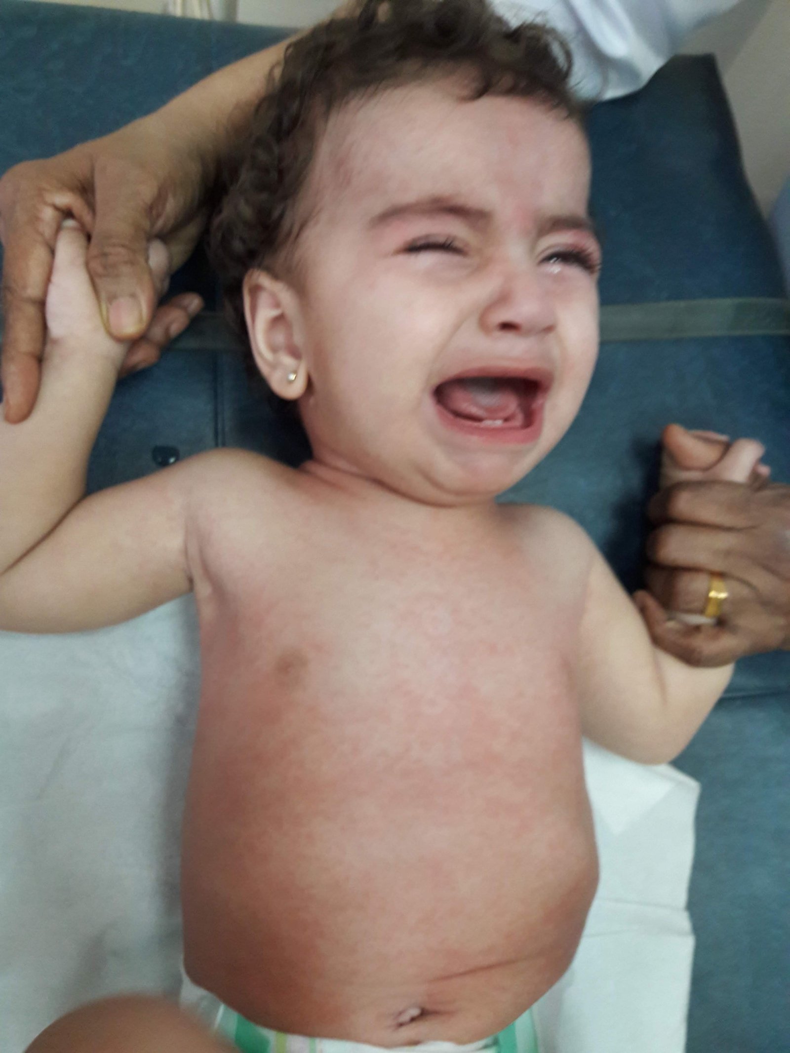 An 11 months old Syrian girl attended our outpatient clinic with a history of rash of one day duration. Patient had a fever for three days which subsided with Paracetamol. Soon after the fever subsided, a rash appeared.