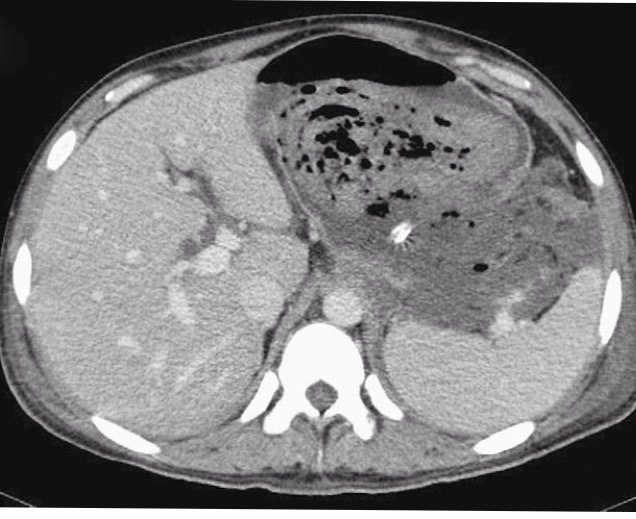 The endoscope could be passed into the duodenum, and no other source of bleeding could be ascertained. A diagnosis of pancreatico gastric fistula was made, and laparotomy was performed. Operative findings revealed that the entire omentum was inflamed and studded with fat necrosis. Necrotic material eroded the whole of the greater curvature and posterior wall of the stomach. The splenic hilum was actively bleeding. All of the necrotic tissue was removed after opening the gastrocolic ligament. A splenectomy was performed after ligation of the splenic pedicle, the stomach was repaired, and a gastrotomy was performed using a 24F mallecot catheter. Drains were inserted in the lesser sac and pelvis, and a feeding jejunostomy was performed. The patient, however, continued to deteriorate postoperatively and succumbed to his illness 3 days after surgery
